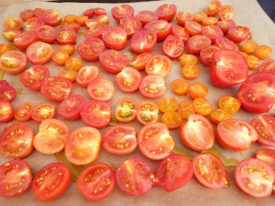 And as you can see from the picture, I don't stick to cherry tomatoes for the sauce recipe either. Whatever I have is whatever gets used. Still tastes just lovely!